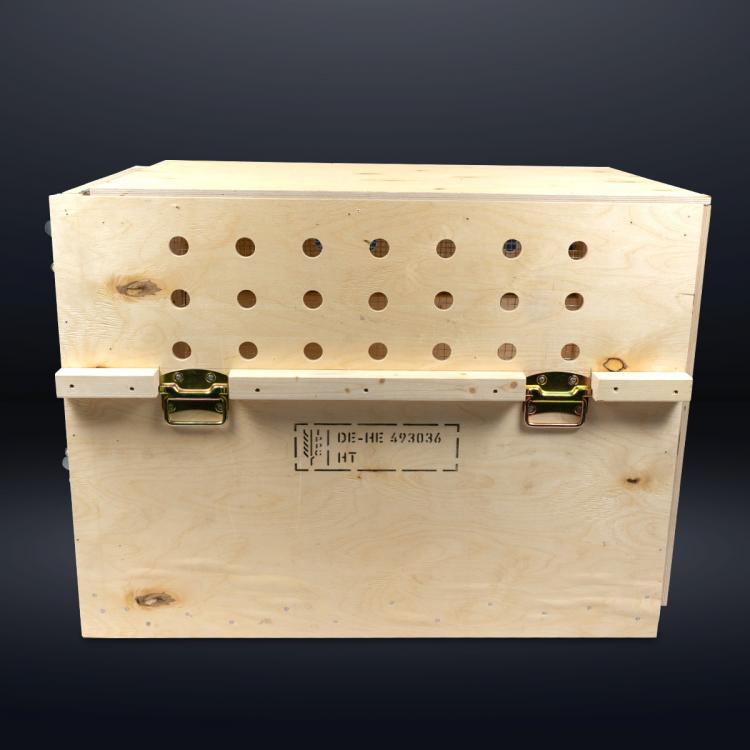 Ebenfalls wichtig: Die internationale Kennzeichnung der Boxen. Auf jeder Box muss ein „Live Animal“- Aufkleber und ein Markierungshinweis für oben und unten angebracht sein (IATA Bestimmungen). Dies ist für die Beförderung unerlässlich und verhindert Fehler beim Weitertransport. Die empfohlenen Transportboxen sind außerdem so konzipiert, dass sie beispielsweise beim Weitertransport im Ausland problemlos verladen werden können. Nicht genormte Transportgehäuse, wie Boxen mit abgerundetem Heck oder phantasievollen Formaten, bleiben dann schon einmal „auf der Strecke“. Auch die Verladehöhe beim Weiterflug sollte vorab bei der Airline überprüft werden.